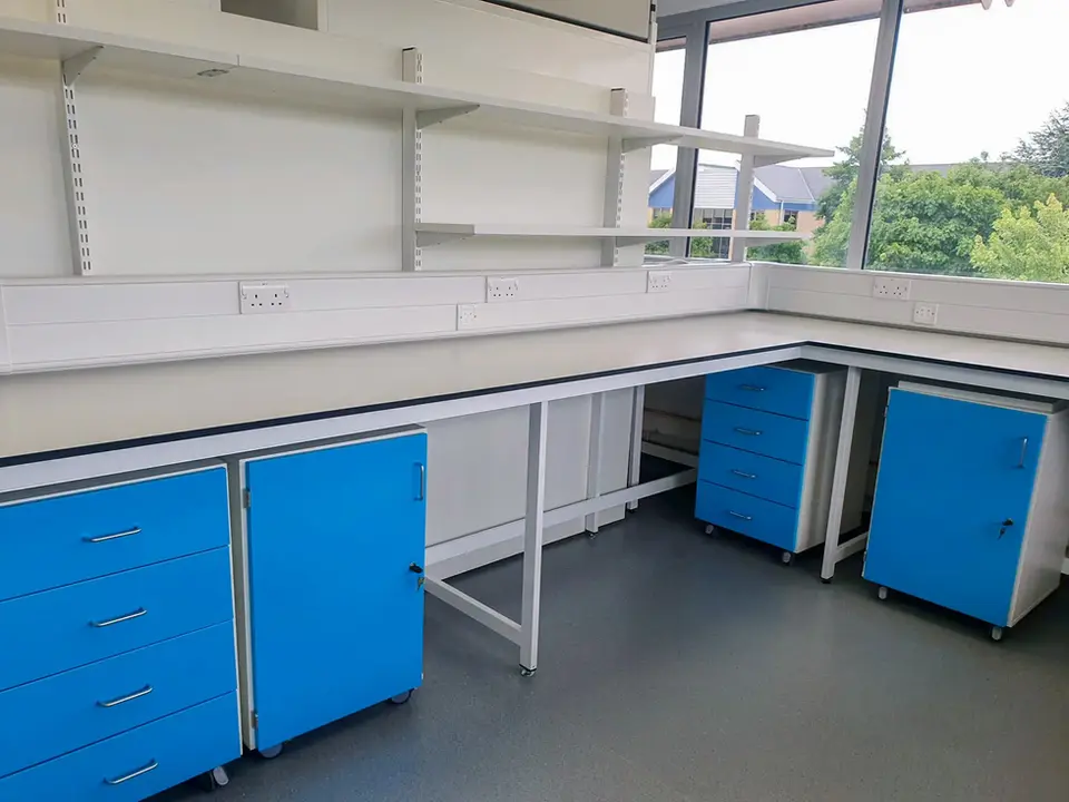 Unistow delivered a full laboratory solution featuring perimeter HiFix benching, single and double lockable mobile units, tall fitted double lockable storage, Trespa pastel grey worktops, an IPS handwash station, spur shelving, and integrated electrical trunking. Each element was carefully designed to optimise workspace efficiency and adaptability.